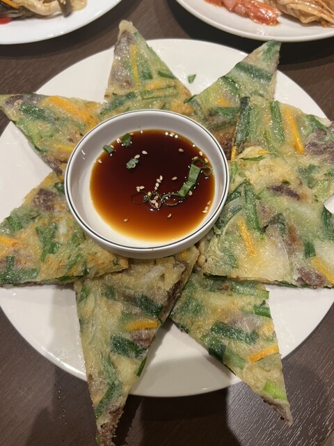 刻まれたすじの歯ごたえも感じる美味しいチヂミ