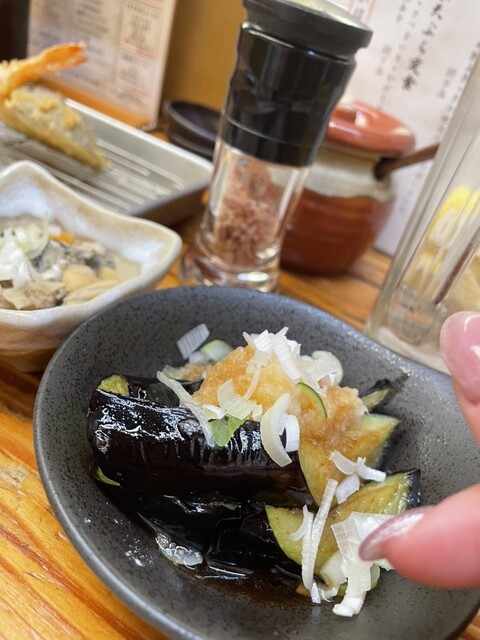 ・千円でドリンク1杯+選べるおつまみ(穴子煮やナスの揚げ浸し)+天ぷら4種(海鮮2野菜2)がコスパ最高過ぎる