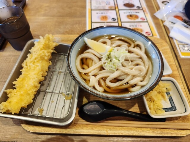 つるもちの白饂飩と腰のある黒饂飩選べる。イカ天ぶっかけは白で。