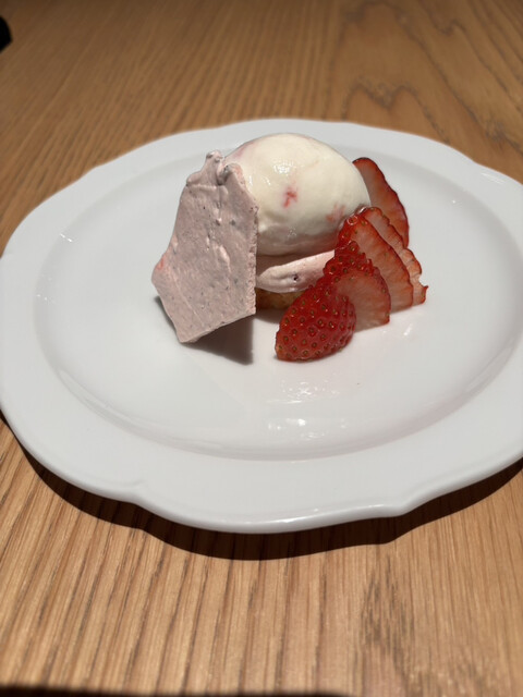 デザートはイチゴのパブロパ。何だかわからないけどとにかく美味しい。薄くスライスしたチーズケーキの上にメレンゲのお菓子とその上にイチゴのアイスが乗ってます。スライスしたイチゴも添えてあり全部を一緒に味わうと昇天です笑