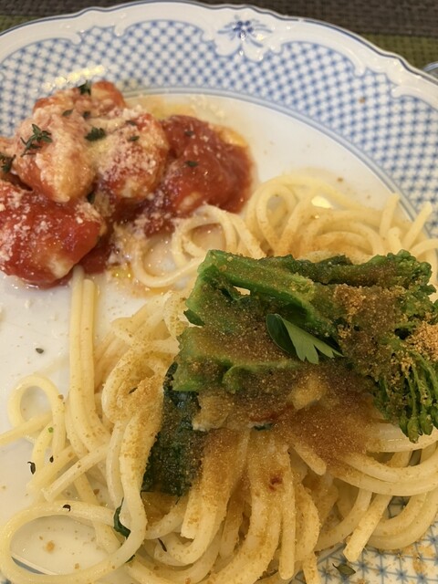プリモで、カラスミのスパゲティとニョッキのトマトソース。