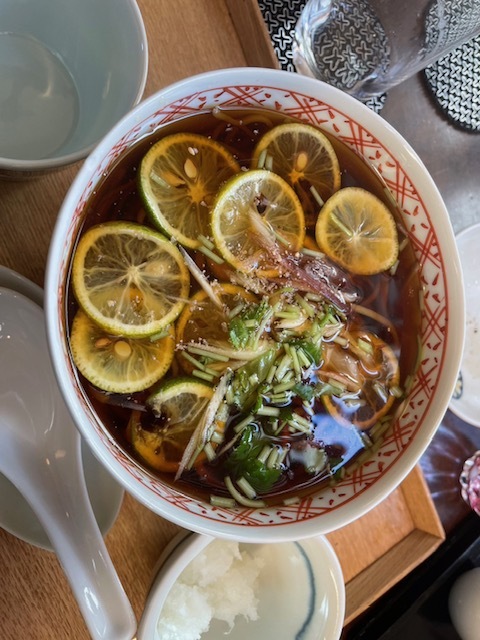 そろそろ蕎麦に。奥さんはすだち蕎麦、僕はせいろを。すだち蕎麦は丼一杯に載せられた輪切りのすだちが豪快。せいろは瑞々しくのど越しのよい上品なお味でもったいないと思いつつ一気に食べてしまいました。しかし追加でお願いした田舎蕎麦は蕎麦がきのようで経験の浅い我々には理解が追い付かず。。