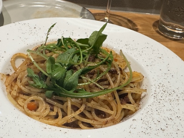 そして肉々しいボロネーゼも素晴らしい。自分で作ると玉ねぎ、にんじん、セロリを刻んで炒めてトマト缶を加えて、と「ミートソース」になるのですが、ボローニャで食べたボロネーゼは確かこんなんだった。