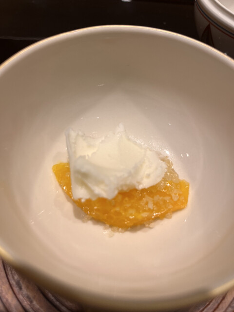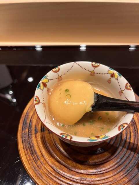 鯛の酒盗の茶碗蒸しは、大分県の卵に葛庵もかかり、玉子豆腐の食感で、鯛のお出汁にゴマ、生姜等の風味も加わり、奥深い味