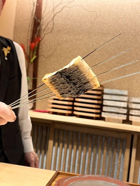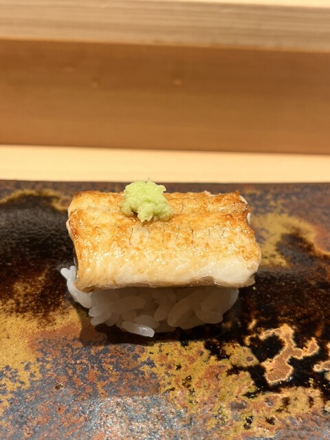 愛知産鰻の白焼き 関西焼きで、外パリッ 食感を味わう為あえて握らずシャリの上に乗せ横はしで
