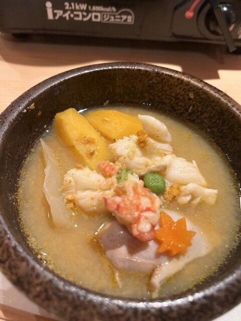 雲丹鍋はお出汁に雲丹を溶かして活伊勢海老の頭 活はまぐり 野菜 最後に伊勢海老の銅身を入れます 沸騰したらお出汁を飲むと
