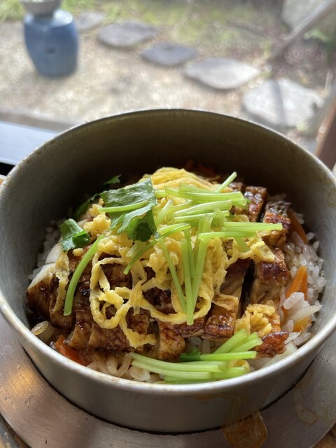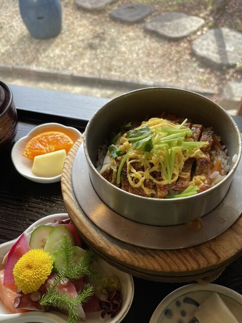 初めて訪ねた時。予め電話で予約してうなぎの釜飯定食を頼みました。窓側の席から庭の景色がとても良いでした。釜飯おいしかったです。ご馳走様でした。