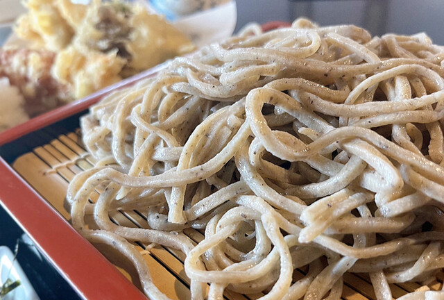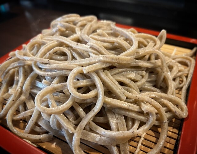 蕎麦殻ごと石臼で粗く挽いた粉を使い、太めに打っています。色は黒っぽく、粗く挽いた蕎麦の実が見えます。