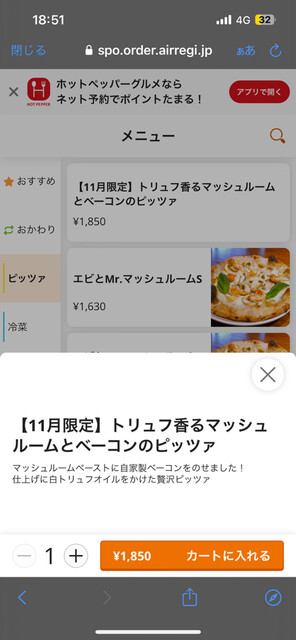 ピザの中では、11月限定のピザが美味しすぎて、レギュラー化してほしいほど。