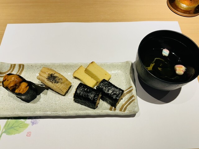ウニ、穴子、玉子、かんぴょう巻き、お吸い物