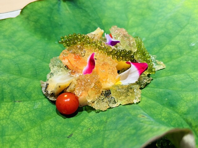 えびとアワビのジュレがけは、ポン酢のジュレでしょうか。歯応えのある鮑と、プリッとしたエビを