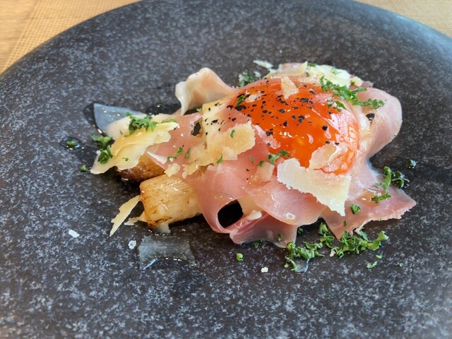 昨年もいただいた、ホワイトアスパラの一皿は、とても好みです。目玉焼きに龍の卵を使っていて、黄身がオレンジ色です。味も濃厚。