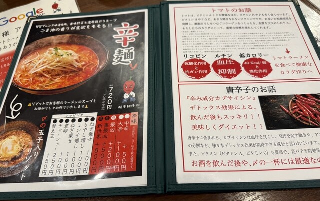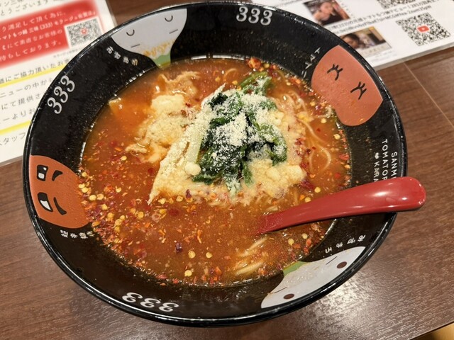 お店のコンセプトは「元祖トマトラーメン」と「辛麺」をお手頃価格で提供すること。単品¥680の元祖トマトラーメンは、初出店記念として年内12月31日まで¥390のサンキュー価格でお財布にも優しい対応です。私は辛麺派なのですが、今回はトマトラーメンに挑戦しました。オーダーはタッチパネルの事前食券購入制。ベースではなく辛さを変更し、トマトラーメン中辛(¥490)におすすめのナチュラル最高級チーズ(¥100)をトッピング。10分程度でオーダーした品が到着し、いざ実食。
