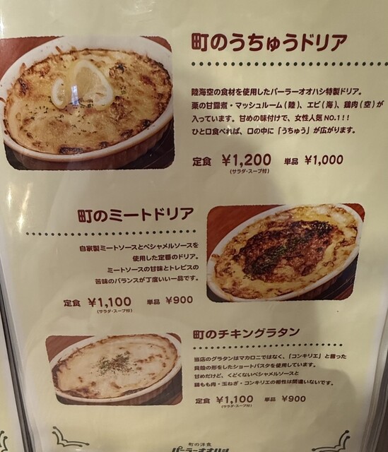 うちゅうドリアはお口の中に「宇宙」が広がる陸海空の食材(マッシュルーム、エビ、鶏肉)を使ったドリア!女性人気No.1のメニュー♪