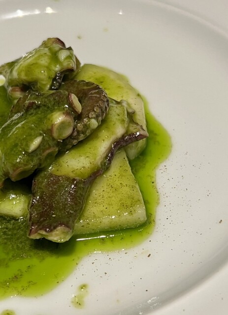 タコはぷりぷりで柔らかく、緑のソース(パセリ系?)が爽やかで美味しかったです。
