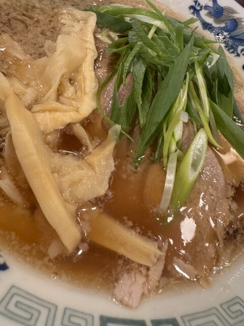 見た目は濃厚な醤油スープですが、あっさりしてチャーシュー、ネギ、メンマが入って中細麺が背脂とニンニクの効いたスープに絡んで美味しく頂きました♪