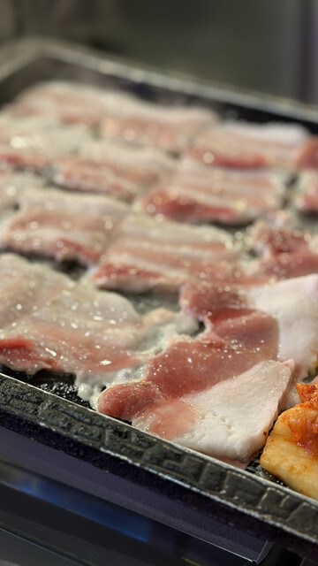 サムギョプサルは厚みがありつつ脂が軽く、焼き上がりは外カリッ・中ジューシー。