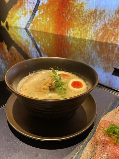 牡蠣から取る出汁が売りのようです。訪問は平日の昼間。やはり人気店。20分ほど待ったでしょうか。完全キャッシュレスの券売機で決めたのは牡蠣白湯『超える』。正直はじめは牡蠣の出汁なんて、臭みもあって食べれたもんじゃないとタカを括っていたが、想像を完全に覆す旨さ。牡蠣の旨みがしっかり出ていて、かつ濃厚なのにサラッと飲めるスープ。女性にも優しいスープは大絶賛。今までに経験のない味わいでした。肉寿司も絶品。スタイリッシュな外観だけでなく、中も素敵で特別な空間。他にも何店舗も運営している『株式会社銀の葡萄』さん、とても気になりました。