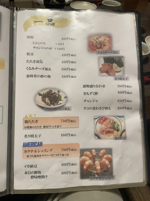 事前に予約し月曜夜6人で初利用。19時半に入店、1番奥の座敷に通される。はじめは明太ポテトサラダ、だし巻き卵、真鱈白子の天麩羅、加賀野菜天ぷら盛、お造り大盛(4人前)などから。順番に出てくるが、どれもめちゃうまい。白子は鮮度がよくわかるうまさ。だし巻きの出汁の味もうまい。刺身も、海鮮太巻きのこぼれるいくらもうまい、コスパもよく久しぶりにこんないい店見つけた!食べてみたいもの全部食べられなかったので絶対また来ます。絶対おすすめ。