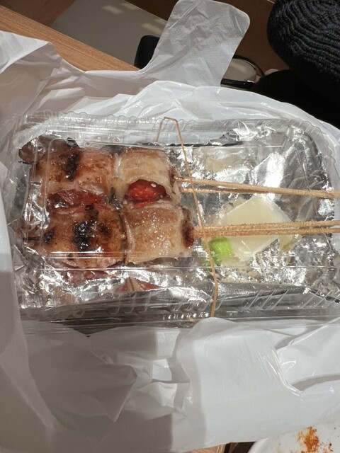 イチゴを豚バラで巻いてあって練乳をかけて食べるという斬新な発想のひと串。
