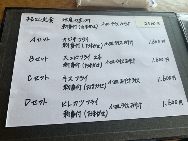 メニューは「大エビフライ定食」、超高級魚の「のどぐろ煮つけ定食」、黄金あじのたたき・なめろう・フライ、カワハギの刺身(肝付き)、ホラ貝の刺身などが並んでいます。