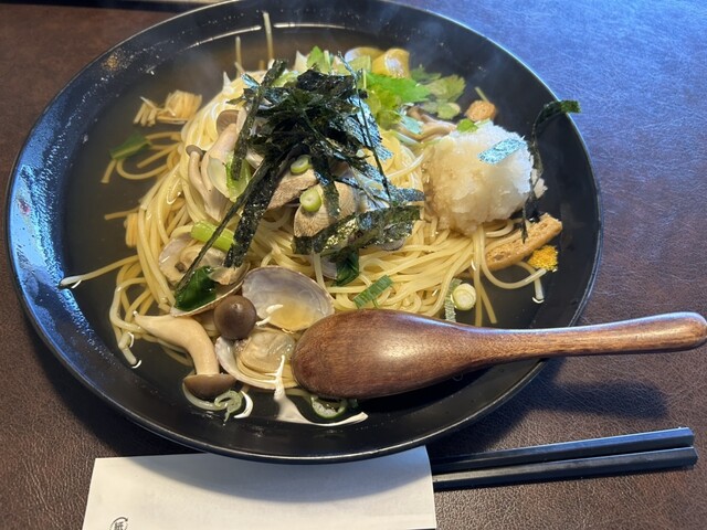 大きなお皿に出汁いっぱいで小松菜らしき野菜と沢庵も入っててあっさり味のとても美味しいパスタでした!