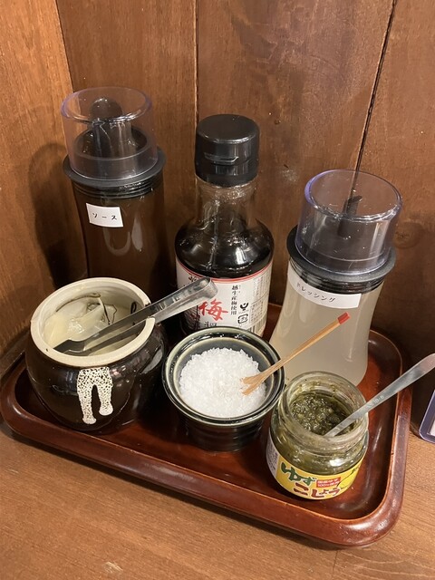 肉厚の鯵は火入れが完璧で、口の中でふわりと解けます。荒めの衣は軽やかで、鯵の旨みを引き立てます。鬼おろしやキャベツ、卓上の梅醤油・ソース・荒塩・柚子胡椒など調味料も多彩で、味変も楽しめます。箸休めのガリもさっぱりして嬉しいポイントです。