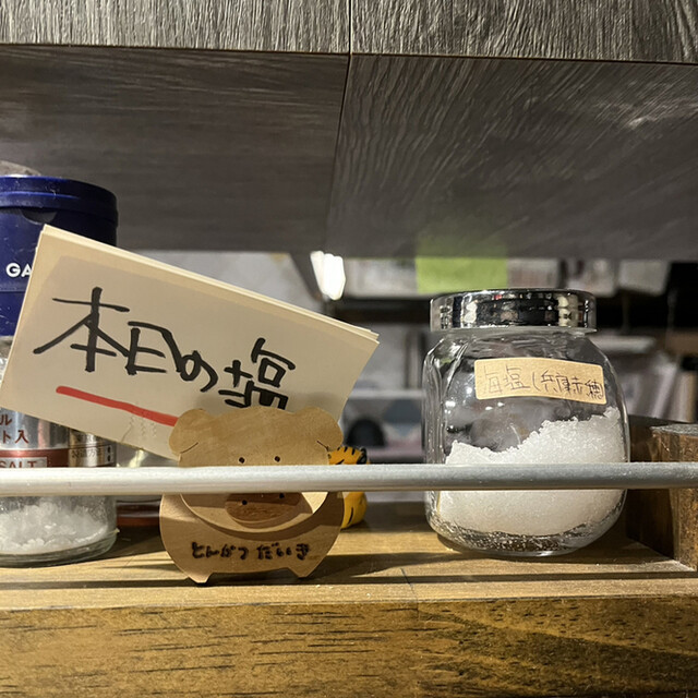 この日の塩は沖縄の海塩。塩を肉に少しつけて食べると味が引き締り、肉の旨みが引き立つ!