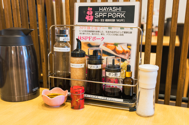卓上には、ソース、ポン酢、醤油、塩などがあり、好みで食べれる。