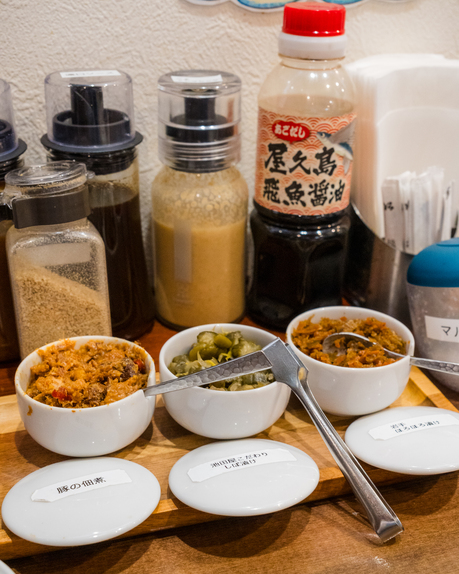 卓上には豚の佃煮、漬物が置かれており、豚の佃煮は甘辛で濃い味でご飯がすすむ!
