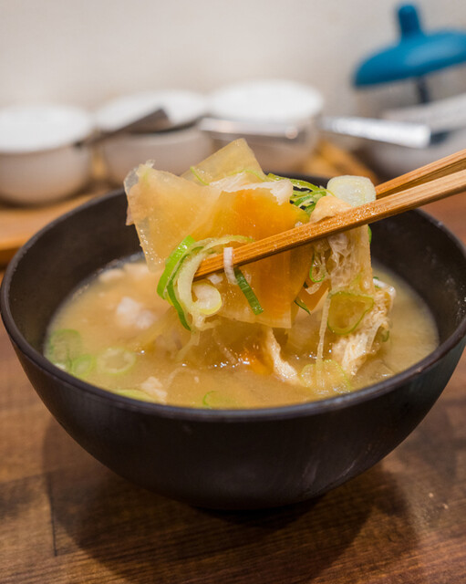 豚肉、大根、人参、薄揚げ、ねぎなど具沢山で食べ応えがあり、生姜の風味がアクセントになってて爽やかな後味。