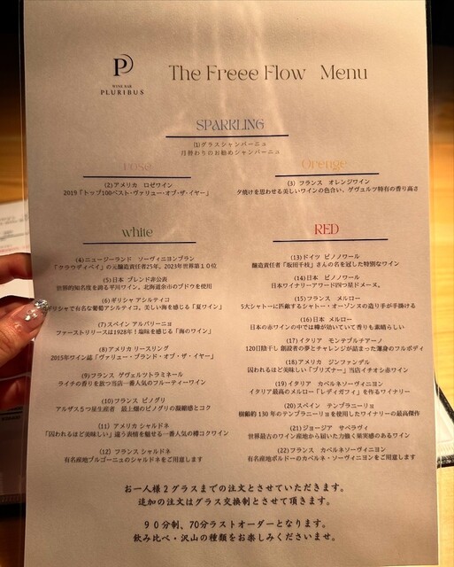 90分フリーフロープランで世界各国のワインを贅沢に飲み比べどれもグラスで提供されて、1杯1杯説明書付きなのが楽しい♪