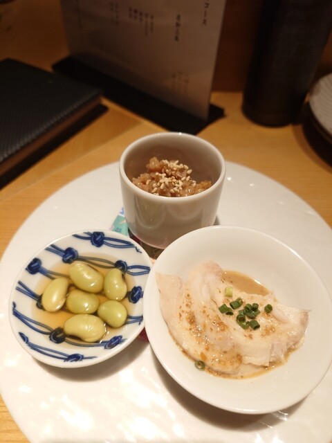 料理を注文。ここは最初にお通しの小鉢3種が出てきて、焼鳥の途中に一品料理が出てくるので、最初に〆以外は全部頼んでオッケー!