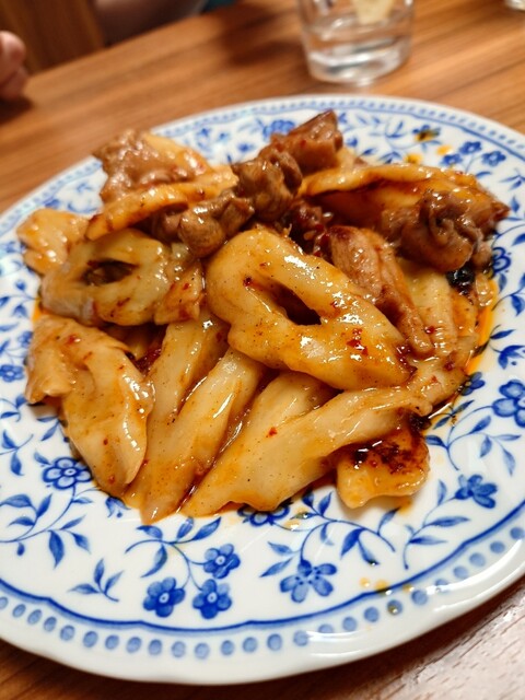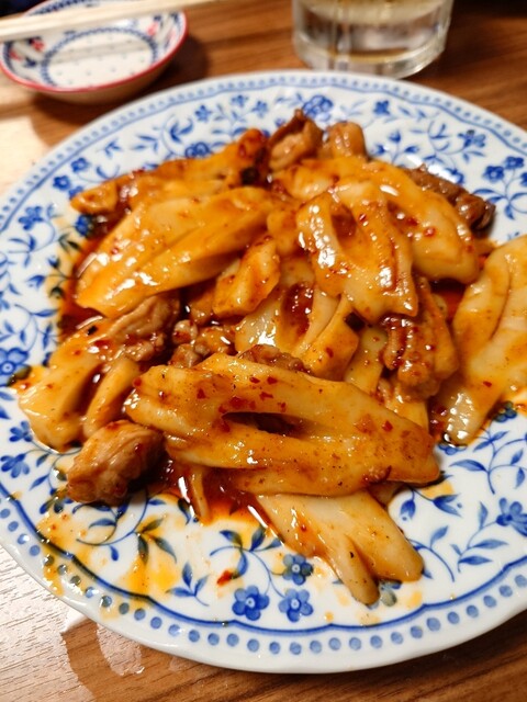 個人的に豊田屋で1番好きなメニューが、鴨ちくわぶ炒め。ピリ辛ダレに鴨の脂吸ったちくわぶが美味過ぎる。絶品なので必ず食べて欲しい。