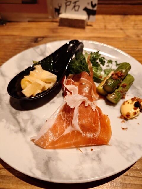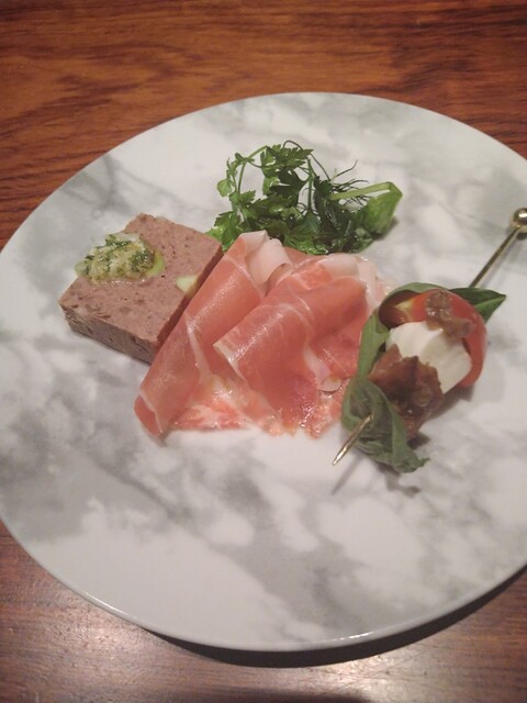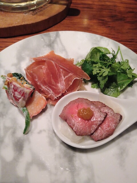 一品目のオリーブ牛の刺身で胃を掴まれ、生ハムメインのけどどれもが主役みたいな前菜盛り合わせ。