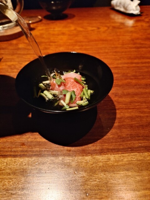 肉刺しから始まり、前菜3種、マグロ節と鰹節の出汁しゃぶは生肉に目の前で熱々の出汁をかけてくれる。