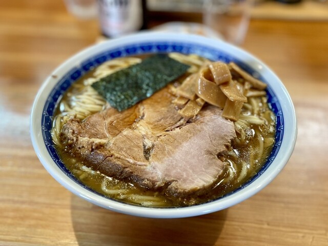 豚肩ロースの大判焼豚・メンマ・海苔・長葱。迫力ある焼豚は見た目豪快だが味付けは品がよくとても美味。メンマは素晴らしいの一言。