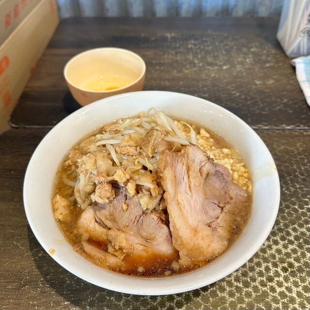 豚2枚、ヤサイ少なめ、ニンニク、麺少なめ