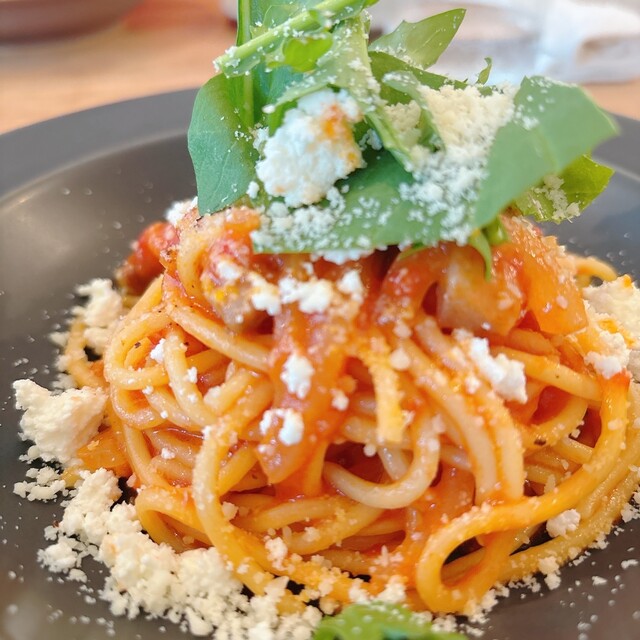 パスタ…今回もトマトソースのアマトリチャーナを頂きました♪ スパゲッティがもっちもちでここより好きなパスタはありません。自家製リコッタチーズも雑味もなくてなんておいしいの!普段はトマトソースは避けがちですが、ここはトマトソースがオススメな気がします。トマトソースの味がおいしいです。