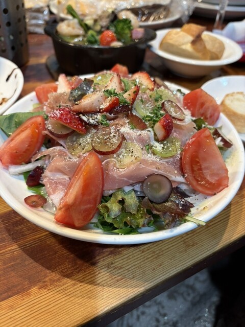 これでもか!というほど、イチゴやブドウ(シャインマスカット含む)がゴロゴロ入っています。生ハムの塩気とフルーツの甘み、そこにクリーミーなチーズとバルサミコソースが合わさって、ワインが止まらなくなる至福の味です。