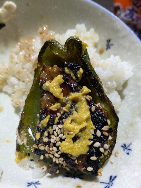 ザ・手作りといった形のピーマンとなすの肉詰め!