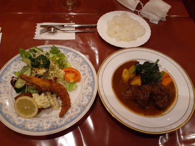 そんな鮮度抜群のサラダを食べつつ、牛タンの赤ワイン煮込みを一口。歯はいらないですね!ものすごく柔らかく味付けもちょういいです。カキフライとエビフライとサクサクジューシーで良いですね。