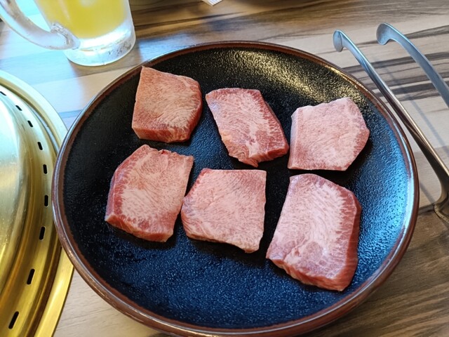 松阪牛とそうでないメニューが色分けされています。迷わず松阪牛の上タン、上カルビ、上赤身、レバー、上ハラミ、ハツ、上ホルモン、しゃぶユッケ風を注文。上タンは自分で塩コショウを振るスタイルです。タンはとにかく歯切れが良く、サクサクとした食感の中に脂と旨味を感じます。ひとテーブル二皿までということなのでたくさん食べられないのが残念。赤身はあまり焼かないのがポイントらしく本当に柔らかい。カルビ、ハラミは意外と肉々しい感じだがどちらも秀逸。何だか白飯まで特別な美味しさに感じます。大盛り2杯いただきました。
