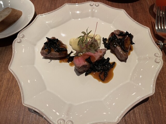 迷った結果、あか牛食べ比べ3種にしました。これまた美味いのよ。ソースはなんだったけな、きのこ?使ったソースでした。お肉とのマッチがもう、言わずもがな。最高です。