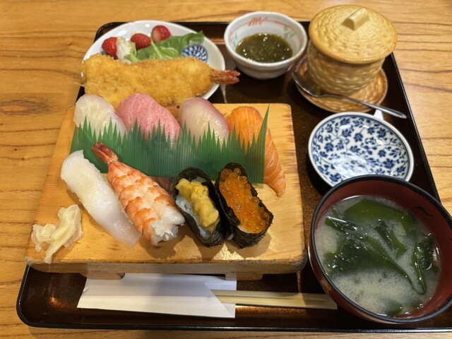 おすしだけじゃなく、茶碗蒸しデカ海老フライ、酢の物、お味噌汁、フルーツまでついてます。