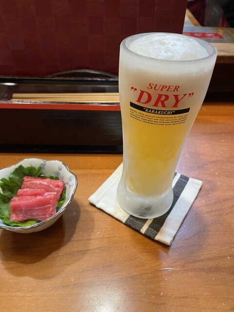生ビールを注文!付き出しの「くぎ煮」でーす!