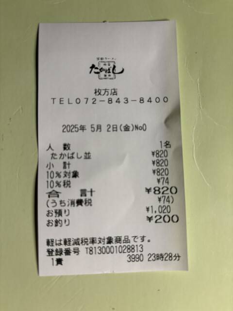 税込820円のたかばしラーメン並盛です❤️㊗️