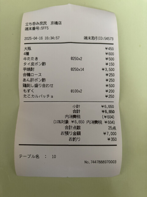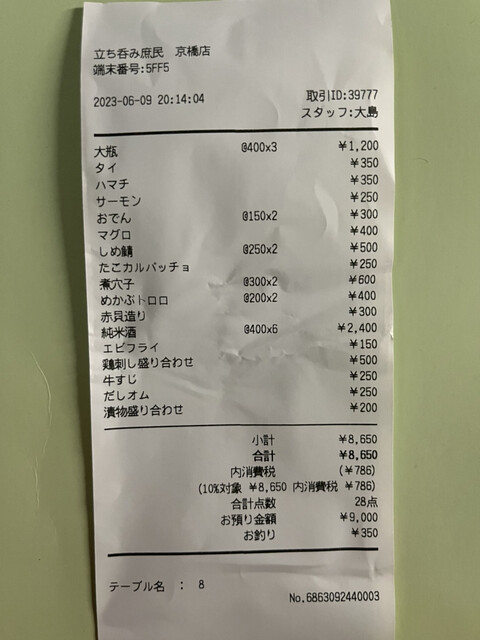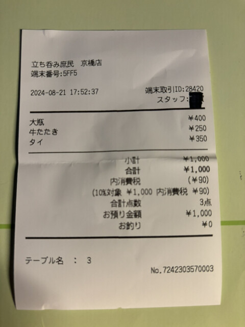 これだけ食べて飲んで、税込み1400円で、お店を後にしました。