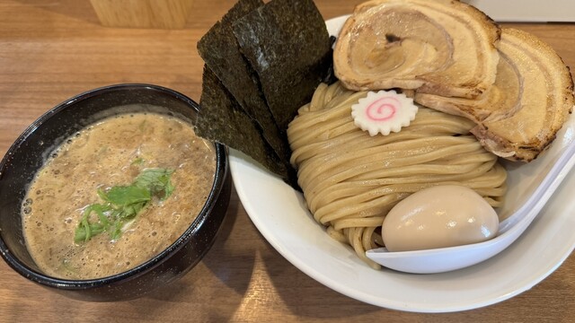 豚骨と鶏ガラに魚介系のダシがしっかり効いた濃厚スープが絶品!極太の平打ちストレート麺はコシがあり、スープとよく絡んで食べ応え抜群。トッピングの大きな豚バラ肉もトロトロでジューシー。こってりしつつも魚介の旨みで後味あっさりなので、胃もたれせずに最後まで美味しく完食できました!また絶対に食べたいつけ麺です!