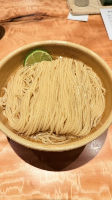 つけ汁は醤油ベースで鰹、昆布、鶏を感じられ塩味は少し強いもののつける量であったり昆布水を混ぜたりして調節できるのがとても良いです。浮いている脂がとにかく美味しく完成度が高いです。